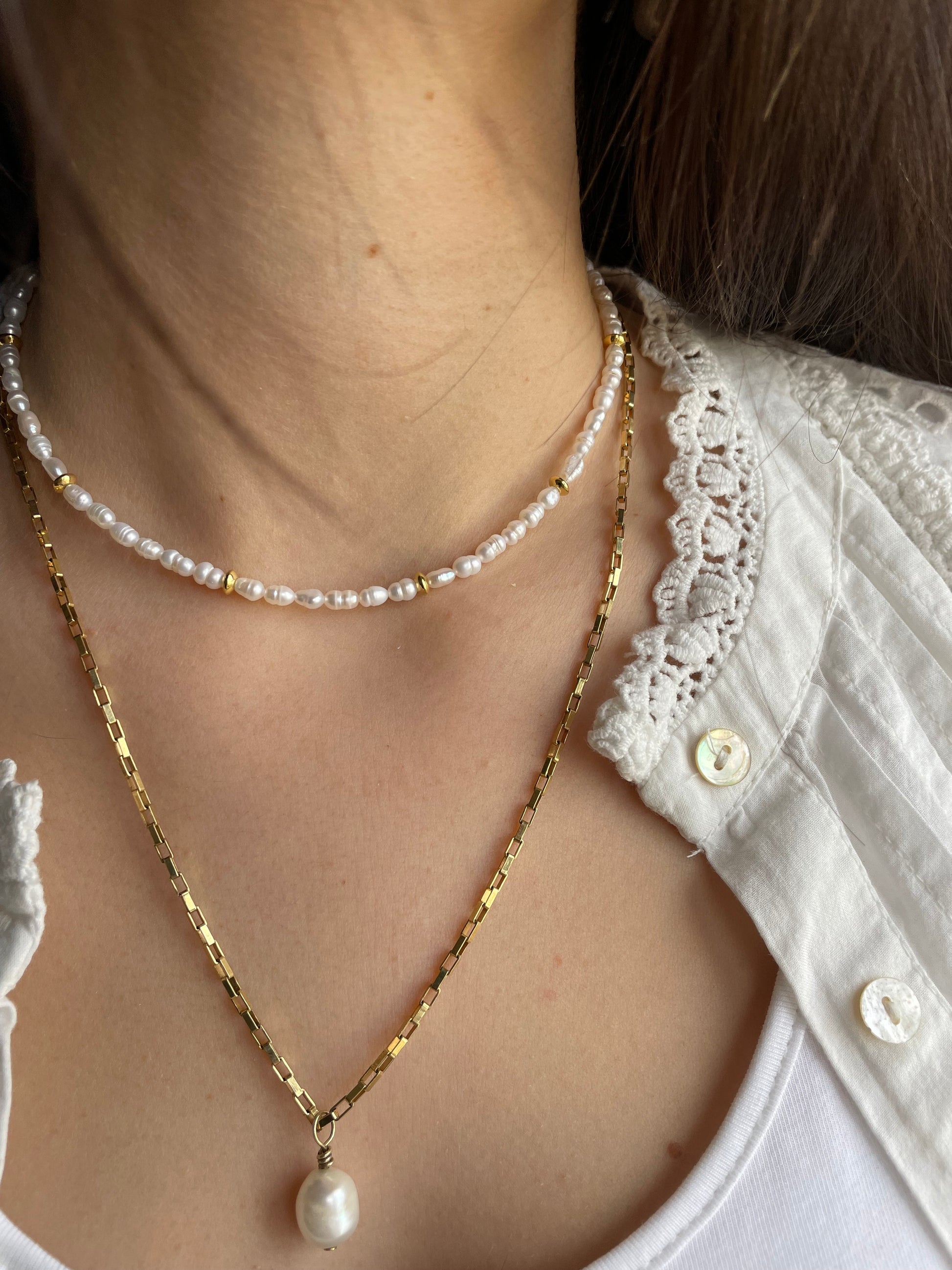 Unsere Amalfi Halskette ist mit süßen, reinen Süßwasserperlen in Deutschland handgefertigt. Die perfekte Ergänzung zu jedem Outfit für einen Hauch von Stil und Eleganz. Besonders lieben wir sie in einem Layering-Look, wie zum Beispiel hier mit Elsa.
